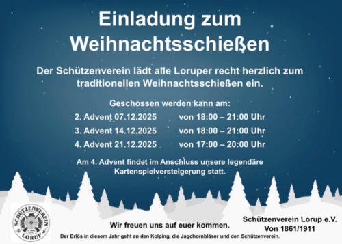 Einladung zum Schützenball Liebe Mitglieder und Freunde des Schützenvereins, Wir laden euch herzlich zum Loruper Schützenball 2026 ein, wo wir gemeinsam mit userem Königspaar Ansgar und Thea einen unvergesslichen Abend feiern möchten. Lasst euch von festlicher Stimmung, Tanz und guter Laune verzaubern und seid dabei bei der aufregenden Saalverlosung Schützenball * 17.01.2026 Einlass um 19:00 Uhr im Saal „Zum Käpt‘n“ Kartenvorverkauf * 04.01.2026 ab 19:00 Uhr beim Schützenhaus Wir freuen uns auf einen unterhaltsamen Abend mit euch. Wir freuen uns auf zahlreiche Gäste! Der Vorstand